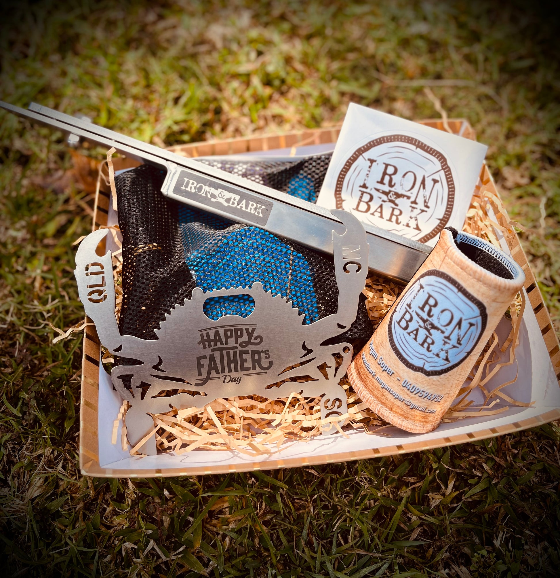 316 stainless steel crab pot spreader + QLD crab measure etched with Happy Fathers Day + 3 pack Krab cuffs + Stubby cooler & Sticker!! 🍻